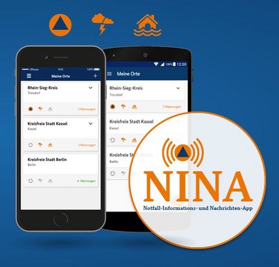 Über die Warn App „NINA“ des Bundesamts für Bevölkerungsschutz und Katastrophenhilfe (BBK) werden Sie jederzeit über Warnungen an Ihrem Standort informiert und auf die zu treffenden Maßnahmen hingewiesen. Dies App finden Sie für Smartphones mit Apple iOS und Android Betriebssystem.