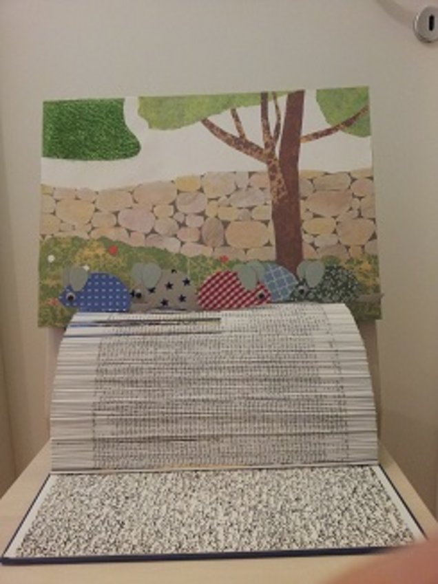 Die Buchbühne ist aus einem alten Buch gebastelt und wird als Bühne für Illustrationen aus einem Bilderbuch genutzt. Mithilfe von Holzstäbchen auf der Rückseite können die aus dem Buch gescannten, ausgedruckten und laminierten, bzw. nachgebastelten Figuren zwischen den gefalteten Buchseiten eingesteckt werden und damit wie auf einer Bühne „stehen“.