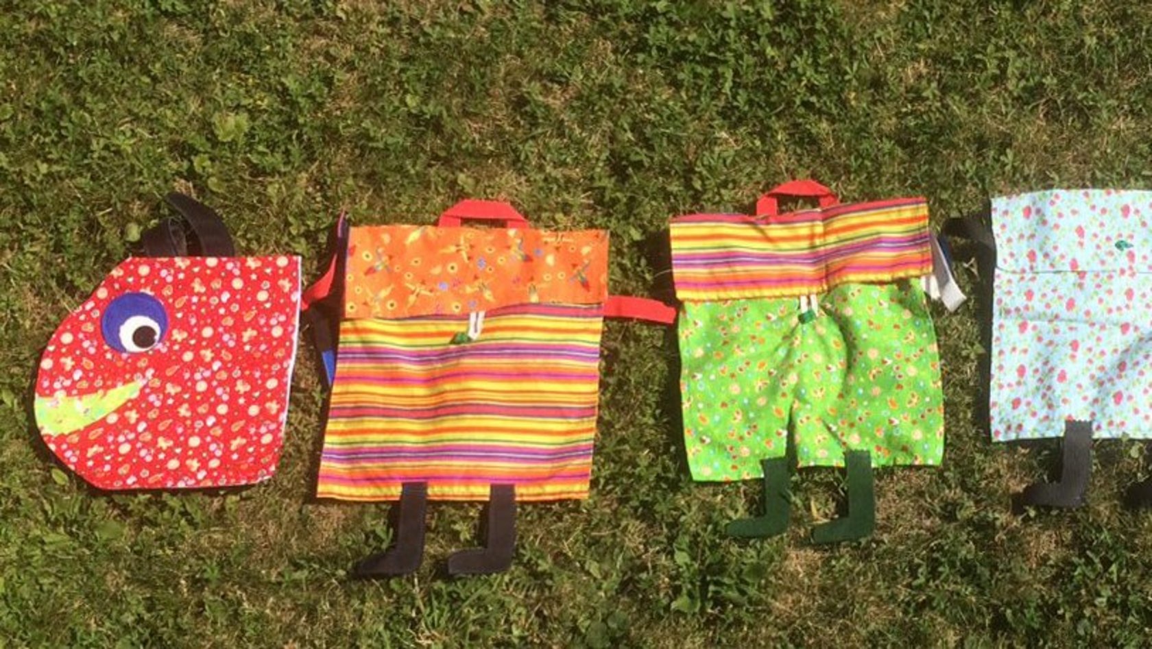 Material: Buntgemusterter Baumwollstoff. Der Kopf lässt sich mit einem Reißverschluss schließen und ist als erste Buchtasche nutzbar. Die Taschen sind mit Klettband verbunden.