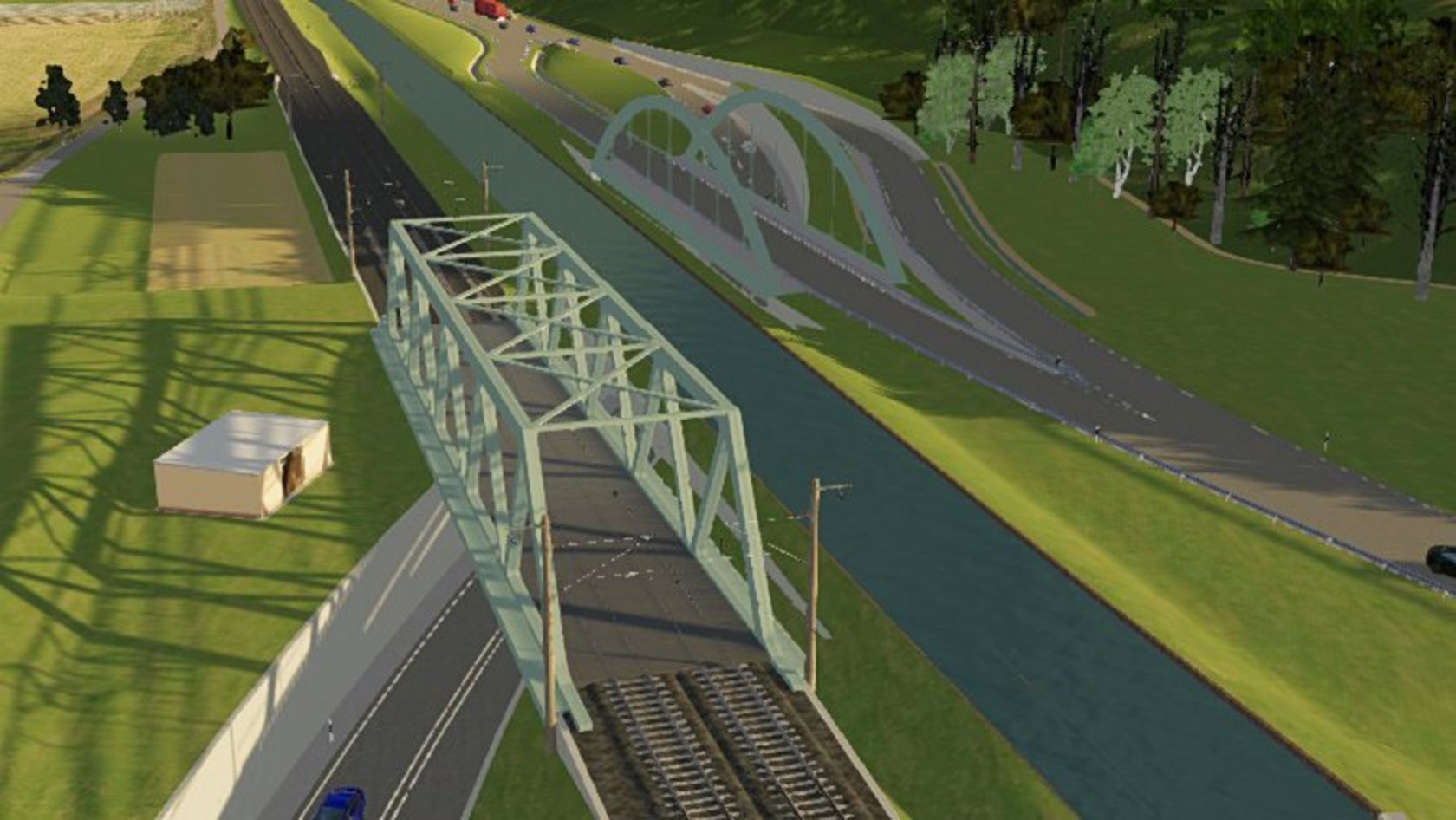 In der 3D-Visualisierung werden die baulichen Maßnahmen und deren Einbindung in die Landschaft möglichst realistisch dargestellt. Damit besteht die Möglichkeit, Straße, Brücken und Hochwasserschutzmaßnahmen virtuell zu betrachten.