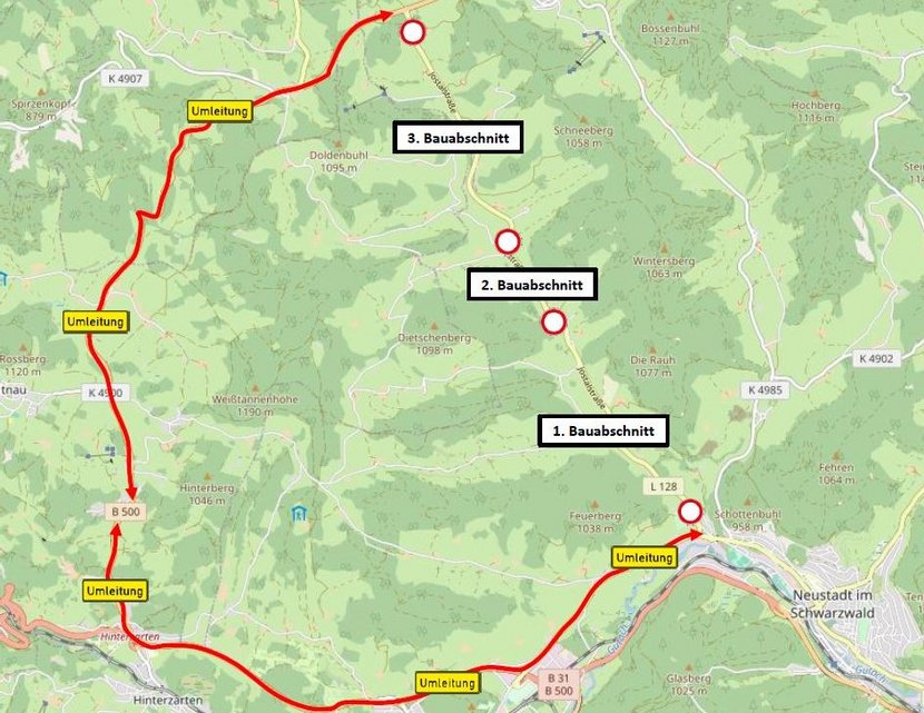 Es wird eine Umleitung über die B 31 und B 500 eingerichtet (s.u.).