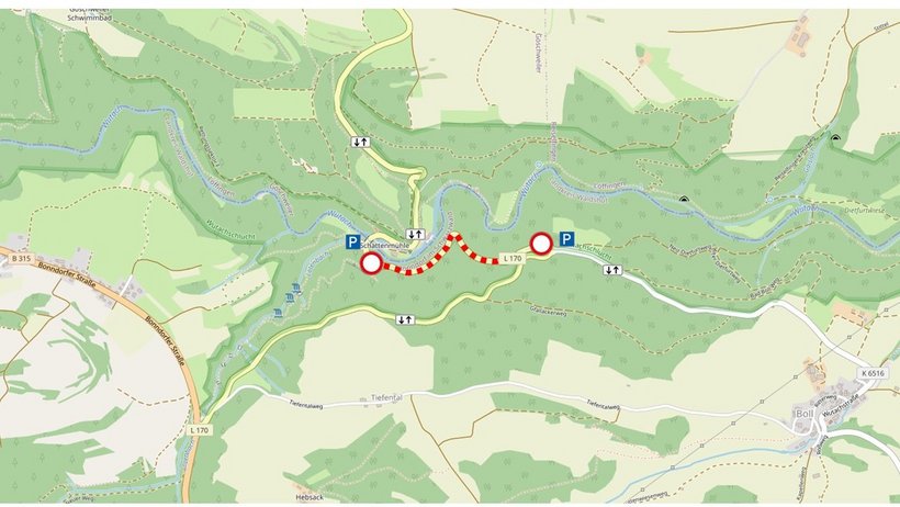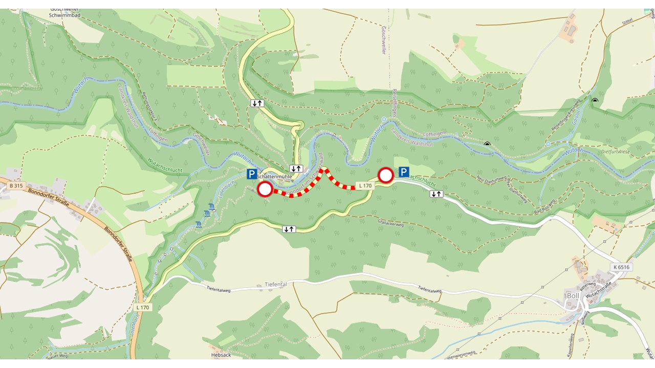 Bitte beachten: Auch Radfahrer und Fußgänger können die Baustelle in dieser Zeit nicht passieren. Die Umleitung des Verkehrs erfolgt von Löffingen über die B 31 nach Titisee-Neustadt und Lenzkirch (L 156/ B 315) und umgekehrt. Die Schattenmühle kann aus Richtung Löffingen angefahren werden, dies gilt auch für den Wanderbus. Auf Bonndorfer Seite fährt der Wanderbus die Parkplätze Lotenbachklamm, Oberhaldenweg und Boll an. Der Abschnitt der L 170 von der B 315 bei Gündelwangen bis zur Abzweigung nach Boll bleibt offen.