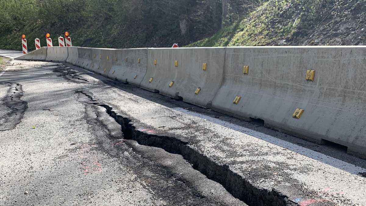 - Starke Niederschläge in den vergangenen Monaten haben temporär wieder zu einer Beschleunigung der Bewegungen und zur Bildung neuer Risse in der bergseitigen Fahrbahn geführt. Ungeachtet dessen werden die Sanierungsplanungen vorangetrieben.
