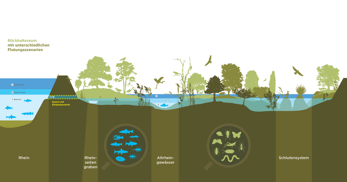 Seit 1964 ist der Rheinwald von Wyhl und Weisweil aufgrund des Staustufenbaus und der Rheinseitendämme von Überflutungen des Rheins abgeschnitten. Seitdem haben sich „trockene“ Lebensräume auf den ehemaligen Auenflächen entwickelt. Heute leben hier größtenteils Tier- und Pflanzenarten, die nicht mehr über spezielle Verhaltensweisen und Anpassungen an das Überflutungsgeschehen in der Rheinaue verfügen. Hochwassereinsätze des zukünftigen Rückhalteraumes führen daher zur Beeinträchtigung und zum Verlust von Individuen bzw. Arten, die nicht überflutungstolerant sind.