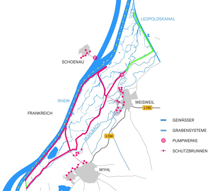 Im Rahmen des Integrierten Rheinprogramms wird am Rhein zwischen Wyhl und Weisweil einer von 13 Rückhalteräumen des Integrierten Rheinprogramms gebaut.