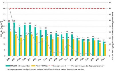 Für Feinstaub war der PM10-Immissionsgrenzwerte (Jahresmittelwert) in Freiburg bei allen Messungen schon ab dem Jahr 2007 unterschritten. Der Tagesgrenzwert von 50 µg/m3 ist in den vergangenen Jahren nur an wenigen Tagen im Jahr überschritten worden (zum Beispiel jedes Jahr in der Neujahrsnacht oder bei lang anhaltenden Inversionswetterlagen).
