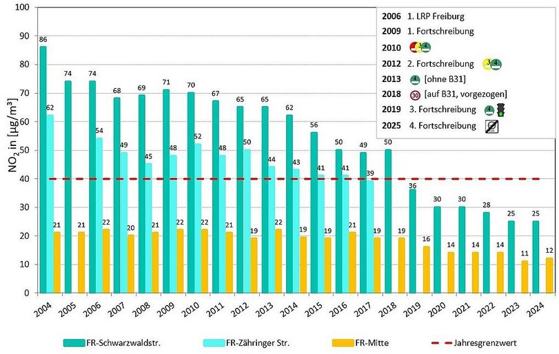 Seit 2019 liegen alle NO2-Jahresmittelwerte in Freiburg deutlich unter dem NO2-Immissionsgrenzwert (Jahresmittelwert) von 40 µg/m3. Da der NO2-Immissionsgrenzwert an der Verkehrsmessstation Freiburg-Zähringerstraße schon 2017 unterschritten war, wurde diese Verkehrsmessstation abgebaut. Wie dem unten angefügten Diagramm ebenfalls entnommen werden kann, haben seither auch die NO2-Messwerte für die städtische Hintergrundbelastung an der Hintergrundmessstation Freiburg-Mitte um ca. 25 Prozent abgenommen.