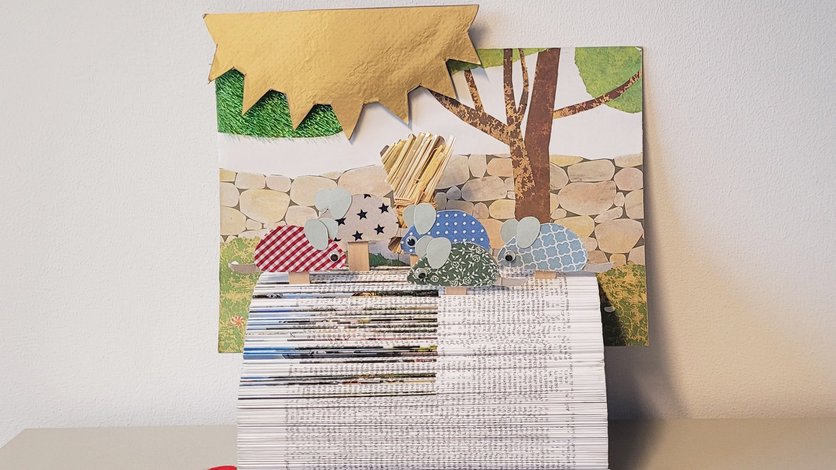 Die Buchbühne ist aus einem alten Buch gebastelt und wird als Bühne für Illustrationen aus einem Bilderbuch genutzt. Mithilfe von Holzstäbchen auf der Rückseite können die aus dem Buch gescannten, ausgedruckten und laminierten, bzw. nachgebastelten Figuren zwischen den gefalteten Buchseiten eingesteckt werden und damit wie auf einer Bühne „stehen“.